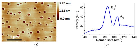 (a) The AFM image of MoS2 film deposited on Si substrate; (b) the Raman spectrum of MoS2.
