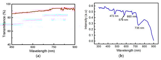 (a) The transmittance the visible light range of the graphene sample; (b) the UV-Vis absorption spectra of the MoS2/Si heterojunction sample in the wavelength range 250–900 nm.