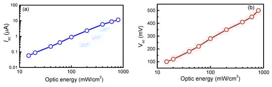 The short-circuit current (ISC) and the open-circuit voltage (VOC) of the graphene/MoS2/Si heterojunction solar cell with different light energies are shown in Figure 6a,b, respectively. VOC represents the voltage when no current is flowing through the device, while ISC shows the current at zero voltage between the electrodes. Generally, ISC and VOC linearly increase with light energy because the photogenerated carriers are in direct proportion to the light energy []. We can see that the conversion of optical energy into electrical energy of the graphene/MoS2/Si device is approximately 2.5%. It is larger than the previously reported values of 2.15% and 1.47% for a monolayer graphene film/Si-nanowire-array Schottky junction solar cell [] and graphene nanoribbon/multiple-silicon-nanowires junctions [], respectively. Moreover, it is almost ten times larger than that of the MoS2/WSe2 [] and the WSe2/MoSe2 Heterostructures []. The high conversion efficiency in our work may be attributed to the following reason. Firstly, electrons in the graphene layer have high mobility, which imparts good conductivity and low contact resistance. Secondly, the double junctions can accelerate the separation process of the photogenerated electrons and holes, thereby decreasing their recombination. Finally, the bulk Si substrate has high carrier collection capability, which can effectively enhance the conversion efficiency.