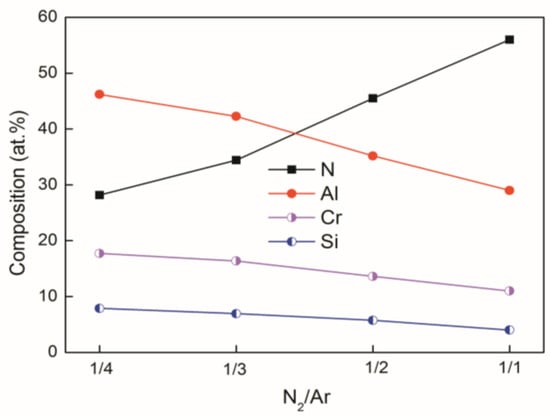 Figure 1 shows the variation of the Al, Cr, Si, and N contents in the AlCrSiN coatings as a function of N2/Ar flow ratio. The contents of Cr and Si in the coating decreased slightly with the increase in N2/Ar flow ratio. These results indicate that nanocrystallites can be completely covered, as Si content increased to approximately 10 at.%. A slight decrease in Si content from 8 to 4 at.% meant a decrease in the amorphous Si3N4 component in the coatings. However, the Al content in the AlCrSiN coatings decreased rapidly from 46 at.% to 35 at.%, independent of the N2/Ar flow ratio. The decreasing trend of these curves can be attributed to enhancement of target poisoning, suggesting that metal ions such as Al ions were more resistant to being sputtered, due to the formation of a nitride on the surface of the composite AlCrSi target. As we expected, N content showed a linearly increasing trend from 28 at.% to 55 at.% with the increasing flow ratio of gas N2 to the inert Ar, indicating the increasing nitrides formed in the coating. It’s believed that the nitride in the coating increased significantly, despite some limitations that may have been present when light elements (N) were measured by EDS in these composition tests. All the results indicated that Al, Cr, Si and N atoms had completely reacted to transform into the nitride state.