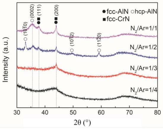 The XRD patterns of AlCrSiN coatings prepared at different N2/Ar flow ratios are shown in Figure 2. As expected, the crystalline microstructure matched with a B1-NaCl cubic crystal structure (fcc) of (Al,Cr)N with obviously preferred (111) orientation at 2θ = 37.8° and (200) orientation at 2θ = 43.9°. Ion bombardment may provide the necessary mobility of adatoms to allow grains to grow with the lowest surface energy (200) parallel to the substrate surface. Georgiadis et al. [] have reported that XRD analysis on AlSiCrN coating reveals a cubic phase of CrN (200), very close to AlN, as a principal structure. Sun et al. [] also indicated that there would be some difficulties in interpreting the experimental data, because the peaks of hexagonal AlN and cubic CrN were close to one position in ICDD (International Center for Diffraction Data) cards. The shifts of AlN peaks detected in the spectra could be explained by the small amount of Cr being dissolved into fcc-AlN lattice. In addition, the phase composition of the AlCrSiN coatings gradually evolved from single fcc-(Cr,Al)N phase to the mixture of fcc-(Cr,Al)N and ZnS-type hexagonal crystal structure with the increase in N2/Ar flow ratio. Meanwhile, the peak intensity of fcc-(Cr,Al)N (200) became obviously more intense with an increase in the N2/Ar volume flow ratio, while for the hexagonal structure AlN, its main diffraction peaks were identified as being along the (0002), (100), (101), (102) and (110) planes, indicating the increased crystallinity of the AlN phase, despite that the crystallinity of coatings was not very high and amorphous phase was still predominant in the coatings, which were deposited at an N2/Ar volume flow ratio of 1/4 and 1/3.