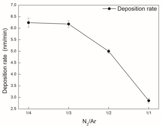 Deposition rate of the AlCrSiN coatings as a function of N2/Ar flow ratio.