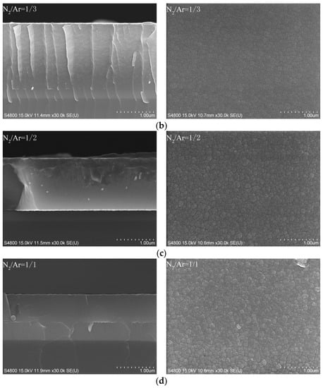 It can be observed in Figure 3 that the deposition rate of the coatings obviously decreased from the maximum deposition rate 6.3 nm/min to the minimum 3.3 nm/min with an increase in the N2/Ar flow ratio. Correspondingly, the coating thickness decreased from 2.04 to 0.94 μm. Target poisoning occurred, and led to more arcing discharge actions during this deposition process, due to more N2 being introduced into the reaction chamber. As a result, more nonconductive products were formed on the target surface corresponding to the decreasing effective excited target area. Jiang et al. [] also demonstrated that the target was fully poisoned when the nitrogen-argon flow ratio was higher than 50%. Summing up, a reduced target power voltage induced by a higher nitrogen-argon flow ratio when we maintained the value of average target power (1 kW) finally gave a lower deposition rate. It’s also noted that the change of the deposition rate closely related to the average free path of the gas molecule and the sputtering rate of the target. The average free path of the sputtered particles was basically the same in this paper, due to the invariable working pressure (0.7 Pa). So, the low sputtering rate of the target should be mainly accounted for the decreasing deposition rate. Furthermore, the lower deposition rate of HiPIMS was largely related to the negative ion effects of negative high-potential cathode targets. Christie et al. [] studied and analyzed the reasons for the low deposition rate of HiPIMS, suggesting that the sputtering metal ion with high ionization rate near the target surface was absorbed by the cathode target, thus leading to a reduction in the sputtering of metal particles.