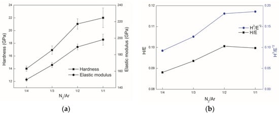 (a) Micro-hardness, elastic modulus and H/E and H3/E*2 values of the Al-Cr-Si-N films as a function of N2/Ar flow ratio hardness and elastic modulus of coatings; (b) H/E ratio and H3/E*2 values of coatings.