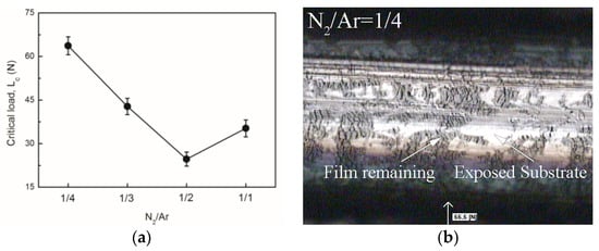 Generally, the critical load, Lc, is defined as the load used to peel off the coating during load application, which can be determined by scratch morphologies or acoustic emission signal. The critical load Lc2 corresponding to the complete peeling off of the coating (exhibited in Figure 7a) is regarded as being representative of adhesive strength between AlCrSiN coatings and SUS 304 stainless steel substrates in this study. Fracturing and delamination of the coatings can be easily observed by SEM. The largest recorded value of 66 N was obtained for the coating with 28.2 at.% N content, corresponding to a 1/4 of N2/Ar flow ratio (see in Figure 7b), due to its dense nanocomposite structure, which presented an excellent interfacial shear resistance. From micro-analysis, it could be seen that the small grains were able to slide and deflect slightly under the combined stresses, which would buffer and release the partial stresses applied to the interface []. From macro-analysis, the compaction effect of the deposited particles introduced compressed residual stress into the coating, and eliminated the internal defects of the coating when the particles with higher kinetic energy collided with the substrate surface. In this case, a strong adhesion was obtained due the difficulty of cracking and peeling off the coating from the substrate. In addition, it’s worth noting that the precise control of deposition process and the unique advantages of HiPIMS technology also played a crucial role in the obtained good adhesive strength.