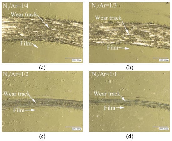 The wear morphology of the AlCrSiN coatings as a function of N2/Ar flow ratio: (a) N2/Ar = 1/4; (b) N2/Ar = 1/3; (c) N2/Ar = 1/2; (d) N2/Ar = 1/1.