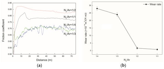 The friction coefficient and the wear rate of the AlCrSiN coatings as a function of N2/Ar flow rate: (a) friction coefficient of coatings; (b) wear rate of coatings.