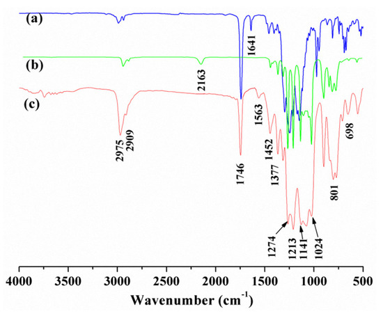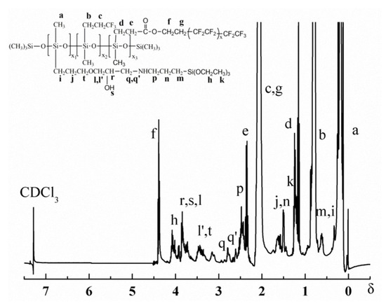 FTIR spectra of the reactants, FA and PFHMS, and the outcome, PFAS, were compared and are shown in Figure 1. Figure 1a denotes the spectrum of the reactant FA. The absorption peaks at about 2975 cm−1, 2909 cm−1, 1452 cm−1, 1377 cm−1, and 1641 cm−1 resulted from the stretching and bending vibrations of alkyl C–H and the stretching vibration of the C=C bond in FA, respectively. The absorption peaks at 1746 cm−1, 1213 cm−1, and 698 cm−1 were associated with the stretching vibration of C=O, the stretching and wagging vibrations of the C–F bond, respectively [15,16,19]. Figure 1b represents the spectrum of the reactant PFHMS. There were typical absorption peaks at around 2163 cm−1, 2975 cm−1, 2909 cm−1, 1452 cm−1, 1377 cm−1, 1274 cm−1, and 801 cm−1, which denote the stretching vibration of the Si–H bond, the stretching and bending vibrations of alkyl C–H, the bending vibration of the C–H bond in Si–CH3, and the stretching vibration of the Si–C bond in PFHMS, respectively. The signals between 1141 cm−1 and 1024 cm−1 are supposed to originate from the stretching vibrations of Si–O–Si bond. Figure 1c is the spectrum of the resultant PFAS. Except for the above signals, the absorption peaks of the C=C bond and the Si–H bond completely disappeared at 1641 cm−1 and 2163 cm−1, indicating that the hydrosilylation reaction proceeded well. Besides, a new absorption peak emerged at 1563 cm−1, resulting from the bending vibration of the secondary amine. The above FTIR results demonstrate that PFAS was successfully acquired.