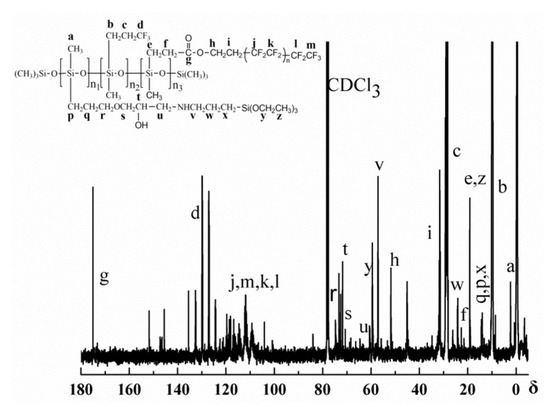 Figure 2 and Figure 3 are the 1H-NMR spectrum and the 13C-NMR spectrum of the PFAS, respectively. Obviously, the relevant chemical shift values of the protons from the PFAS were observed at δ 0.1 (aH), 0.6 (mH and iH), 0.9 (bH), 1.2 (kH), 1.4 (dH), 1.5 (jH and nH), 1.9 (cH and gH), 2.3 (eH), 2.4 (pH), 2.6–2.8 (q’H and qH), 3.4 (l’H and tH), 3.7 (lH, rH and sH), and 4.3 (fH), respectively. In addition, the corresponding 13C chemical shift values of the PFAS could be identified at δ 2.1 (aC), 10.1 (bC), 14.1 (qC, pC and xC), 19.1 (eC and zC), 22.4 (fC), 24.4 (wC), 28.4 (cC), 31.4 (iC), 52.0 (hC), 57.0 (vC), 59.7 (yC), 61.0 (uC), 72.2 (tC), 73.0 (sC), 75.3 (rC), 108–120 (jC, mC, kC and lC), 130.1 (dC), and 175.3 (gC), respectively. Thus, on the basis of the FTIR and NMR results, the conclusion can be drawn that the as-prepared PFAS molecule has the due structure.