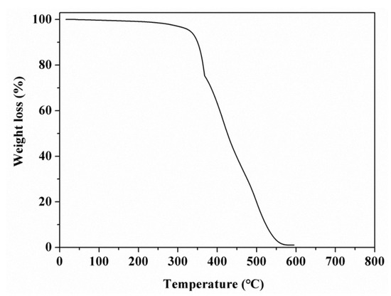 Thermal stability was interpreted with thermogravimetry analysis (TGA), which was conducted on a Q500 thermogravimeter (TA Instruments Company, New Castle, DE, USA) at a heating rate of 10 °C/min from ambient temperature to 600 °C in an inert atmosphere.