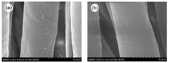 SEM images of (a) the blank cotton fabric and (b) the PFAS-treated one.