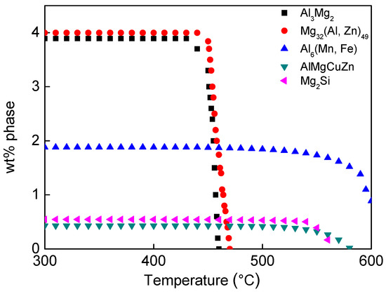 Figure 2 shows the JMatPro simulation results illustrating the secondary phase formation with temperature change. The possible precipitates in Al 5XXX alloys are β(Al3Mg2), τ(Mg32(Al, Zn)49), Al6(Mn, Fe), AlMgCuZn, and Mg2Si. The dissolution at 478.2 °C, shown in Figure 1, corresponds to β and/or τ phase. Since the dissolution temperature of the β phase in the ordinary Al-Mg alloy is near 470 °C, the effective homogenization temperature for the β, τ phase reduction without Mg2Si dissolution was considered to be 450 °C.