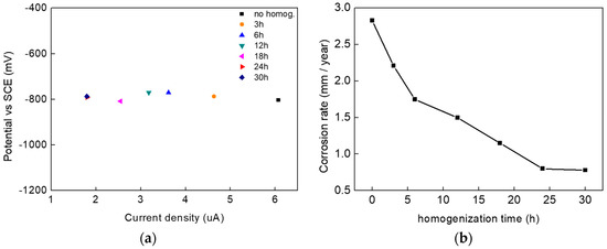 Figure 3 illustrates the results of the polarization test. Tafel test was carried out to determine the change of potential and current density with homogenization time. In Figure 3a, the potential can be seen not to change with increasing homogenization time. This is because there was no significant change in the alloy composition with homogenization. The corrosion rate expressed in Equations (1) and (2) in ASTM G102 can be calculated from the measured current density in the Tafel test [18].