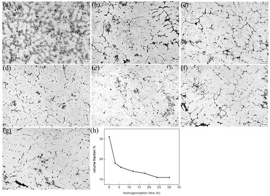 Figure 4 demonstrates the change in microstructure with homogenization time. In order to numerically express the grain boundary volume fraction, program calculation was carried out and the results are shown in Figure 4h. Due to the grain growth, the grain boundary volume fraction decreases as the homogenization time increases to 24 h. After 24 h, the decrease slows, as anticipated by Fick’s law; a similar result was reported by Li et al. [19]. The shapes in Figure 3b and Figure 4h were very similar. Therefore, it can be considered that the corrosion rate and grain boundary are closely correlated.