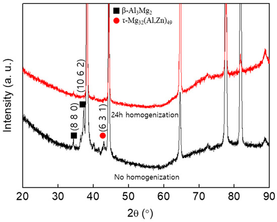 Figure 5 displays X-ray diffraction analysis results confirming the existence of a secondary phase during the homogenization. Before the homogenization, peaks (8 8 0) and (10 6 2), which can be indexed to the β phase, and peak (6 3 1), which is ascribed to the τ phase [20], are observed. After 24 h of homogenization, the β and τ phases disappeared due to the dissolution of the second phases.
