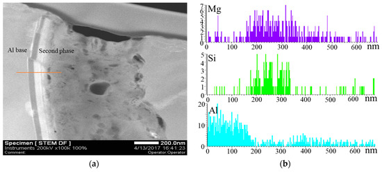 Figure 9 shows results of TEM-EDS line scanning of the interface between the Al matrix and the secondary phase after homogenization for 24 h at 450 °C. After the homogenization, a remainder of Mg2Si phase was confirmed.