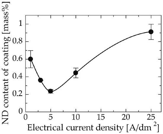 The effect of the current density during electrodeposition on the ND content of the coating is shown in Figure 5. Current density can be interpreted as the deposition rate. The ND content decreased with increasing the current density, reached a minimum of approximately 0.23 wt % at 5 A/dm2, and then increased thereafter. The existence of a minimum value may indicate a change in the dominant mechanism. The following mechanism is proposed. In general, the particle content in composite coatings is determined by the competition between the deposition rate of the metal matrix and the adsorption rate of the additive particles. In the range from 1 to 5 A/dm2, the adsorption of NDs onto the substrate surface may have become dominant, resulting in an increase in the ND content of the coating at especially low current densities. A similar behavior has been observed in composite coatings that follow Guglielmi’s model [32]. By contrast, when the current density is greater than 5 A/dm2, the adsorption of NDs must have been promoted by the high overpotential resulting from the increase in the current density [33], thereby enhancing the incorporation of NDs into the coating. In addition, the high current density may have promoted copper deposition bridging the incorporated NDs, leading to better adhesion. Molina et al. [34] found that nickel bridging alumina particles deposited when a high voltage was applied in the electrodeposition of nickel on aluminum alloy/alumina particles composite, while nickel could not be deposited on the surface of alumina particles at low voltages. A similar phenomenon may have occurred at high current densities.