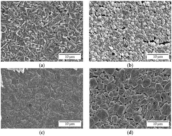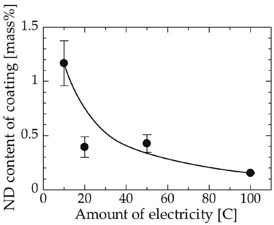 Figure 6 shows the relation between the amount of electricity and the ND content of the coating. The amount of electricity nearly corresponds to the thickness of the coating. Coatings deposited using relatively small amounts of electricity, i.e., the thinner coatings, contained more ND particles compared with those deposited using larger amounts of electricity, i.e., thicker coatings. These results suggest that NDs were incorporated during the early step of electrodeposition and were unevenly distributed in the thickness direction. This may be because NDs poorly adsorb onto substrates that exhibit substantial roughness due to their difficulty in entering the dents. SEM observation of the surface was conducted to investigate the change of the surface morphology of the coating when the amount of electricity was varied. As evident in the surface SEM images (Figure 7a–d), the grain size of the deposited copper matrix was small when the amount of electricity was small and increased with increasing the amount of electricity. The surface roughness seemed to increase as grains became larger. The ND adsorption onto the coating surface was hindered by the increase in surface roughness corresponding to the increase in the amount of electricity. Such a change in the surface morphology of the coating may be responsible for the decrease in the ND content of the coating. In addition, a certain thickness, i.e., amount of electricity, may have been necessary for the copper to cover the initially adsorbed NDs since the copper must have deposited mainly on the copper matrix and not on the ND surface, as discussed in Section 3.4 [34]. This may have hindered further NDs from being incorporated into the copper matrix in the experimental condition considered in this study.