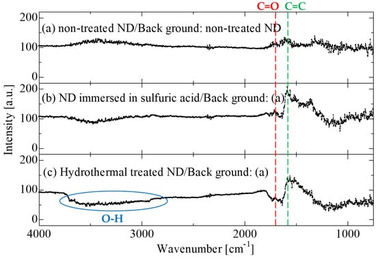 Surface modification of NDs was carried out by hydrothermal treatment at 493 K for 2 h in concentrated H2SO4 solution. The surface-modified NDs were characterized using FTIR measurements because acid treatment has been reported to introduce functional groups onto the surface of NDs. The obtained FTIR spectra are shown in Figure 8. NDs that were only immersed in H2SO4 were also characterized for comparison. The peak near 1600 cm−1 indicates a decrease in the number of C=C bonds, and the peak at approximately 1700 cm−1 indicates an increase in the abundance of C=O bonds. In Figure 8c, a peak from approximately 3500 cm−1 to approximately 2500 cm−1 is also observed. This peak may indicate an increase in the number of–OH bonds derived from the carboxyl groups. These results show that the numbers of–OH bonds and –C=O bonds increased on the surface of the ND particles as a result of the hydrothermal treatment, whereas the number of C–C bonds decreased. Consequently, the results suggest that carboxyl groups were introduced onto the NDs as a result of the hydrothermal treatment [35]. Jiang et al. reported that the oxidation treatment of activated carbon using concentrated H2SO4 at 533 K introduced mainly carboxyl groups (COO–species) and hydroxyl groups (–OH) [36]. A similar phenomenon may have occurred in the present study.