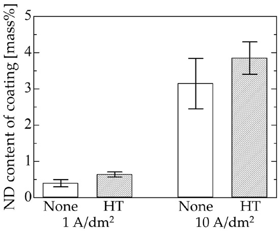 The ND content of coatings deposited using surface-modified NDs are summarized in Figure 9. The ND content of the coating increased by 30 to 60% when surface-modified NDs were used. Hydrothermal treatment has been reported to improve the colloidal stability of the ND particles in water [37], which likely led to our observed increase in the amount of NDs incorporated. Moreover, the positive charge induced by the excess protons, as discussed in Section 3.2, may have been intensified by the additional carboxyl groups introduced by the hydrothermal treatment. Using the hydrothermally treated ND particles under conditions of a 0.1 M CuSO4 bath, an initial ND concentration of 3 g/L, a stirring speed of 500 rpm, a current density of 10 A/dm2, and an amount of electricity of 20 C, a coating with an ND content as high as 3.85 mass % ND, corresponding to nearly 10 vol % ND, was attained.