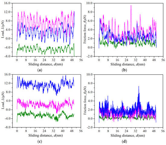 The instantaneous normal load L and instantaneous friction force f are calculated by summing all the normal and lateral interface forces of the substrate atoms acting on the tip atoms during the simulation. To eliminate the high-frequency vibration induced by the stick-slip phenomenon, the L–d and f–d curves are smoothed using adjacent-averaging method. The typical instantaneous L and f signals are displayed in Figure 2 as a foundation of the sliding distance d = v·t with v = 100 m/s. For the nanopatterned surface, the L–d and the f–d curves appear to be dominated by peaks and troughs with periodic distributions, as shown in Figure 2a,b. In contrast, the normal load and friction force fluctuate with relative small amplitude and high frequency for the smooth surface, as shown in Figure 2c,d.