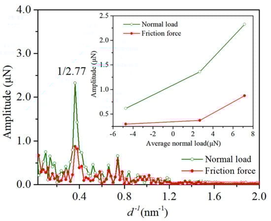 The periodic oscillations of the normal load and friction force for the nanopatterned surface were analyzed using fast Fourier transformations (FFTs), and a sample of the amplitude spectra is shown in Figure 3. The spectra of the normal load and friction force exhibit well-defined peaks at 1/2.77 nm−1, indicating a coincident periodic oscillation of the normal load and friction force with a period of 2.77 nm. The oscillation periods are slightly larger than the nanopattern period of 2.17 nm. In addition, the oscillation amplitude of the normal load increases with an increase in the average normal load, as well as the friction force, as shown in the inset in Figure 3. Moreover, the high frequency signals overlap with the periodic friction force signals, and the oscillation amplitude becomes nonuniform with a decrease in the normal load (Figure 2b), indicating inconspicuous periodic oscillations of the friction force.