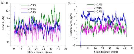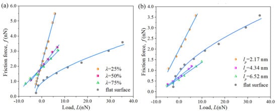 The geometry effect of the nanopatterned surface on the friction law was further investigated. Figure 10a shows the f–L dependence as a function of the area ratio λ with a constant nanopattern period lp of 50%. The linear dependences of f–L are maintained when the area ratio of the nanopatterned surface changes within the range of 25% to 75%. Both the fitted slope μ* and offset L0* monotonically decrease with an increase in the area ratio, and thus the three f–L curves only intersect at one point, as indicated in Figure 9a. Hence, for a large normal load, the friction force decreases with an increase in the area ratio, but the opposite occurs for a small normal load. This result reveals that although the linear load dependence of the friction force is independent of the geometry parameters, the fitted slope μ* and offset L0* vary significantly with the geometry parameters of the nanopatterned surface. Moreover, the nanopatterned surfaces with lp = 50% exhibit greater friction forces than the flat surface at any load.