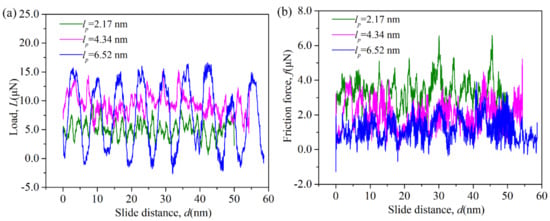 Figure 5 shows the instantaneous normal load and the friction force related to the period width lp of the nanopatterned surfaces with λ = 50%. The increase in the oscillation period and oscillation amplitude with an increase in lp is arrestive. The oscillation period increases from 1/2.77 nm−1 for the nanopatterned surface with lp = 2.17 nm to 1/4.25 nm−1 for the surface with lp = 4.34 nm to 1/6.25 nm−1 for the surface with lp = 6.52 nm, indicating the correlation between the nanopattern period and oscillation period. The large nanopattern period results indicate that the tip can barely feel the substrate when it moves into the groove, and it is rapidly captured by the substrate when it moves above the protrusions. In fact, the valleys of the normal load and friction force approximate to zero, as shown in Figure 5.