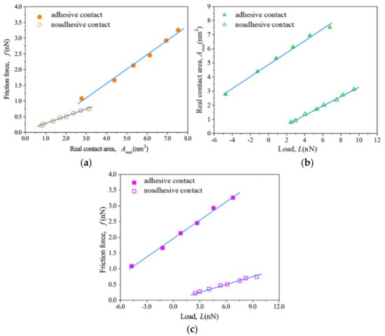where Af0 is a small offset. In nonadhesive contact, Af0 approximates to zero, i.e., f = τAreal. In adhesive contact, the disappearance of Af0 requires the normal load to become negative. The linear f–Areal relationship is also valid for the flat contact surface, as shown in Figure 8a. Our simulation data reveal that the friction force f depends linearly on the real contact area Areal for both the nanopatterned surface and the flat contact surface in either adhesive contact or in nonadhesive contact at the nanoscale. This linear real contact area dependence of the friction force has been found for H-terminated diamond surfaces [] and atomically rough Fe surfaces [] at the nanoscale.