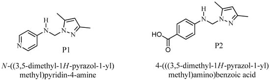 An aqueous solution of HCl (1 M) was prepared from concentrated HCl (37%, analytical grade) by dilution with Milli Q water. Solutions of N-((3,5-dimethyl-1H-pyrazol-1-yl)methyl)pyridin-4-amine (P1) and 4-(((3,5-dimethyl-1H-pyrazol-1-yl)methyl)amino)benzoic acid (P2) solutions were prepared in water with various concentrations.