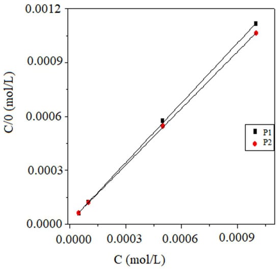 Figure 2 shows a graph obtained from plotting C/θ versus C—a linear relationship was obtained, with a correlation coefficient (R2) values of 0.99973 and 0.99981 for P1 and P2, respectively, at 308 K. The results indicate that the adsorption of the inhibitors P1 and P2 on the metal surfacecould be fitted to the Langmuir adsorption isothermshown in Equation (6) [33].