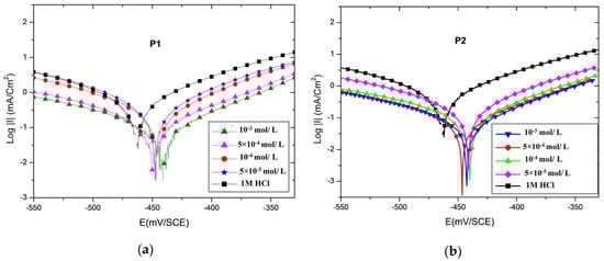 The potentiodynamic measurement results of mild steel in an aqueous solution of HCl (1.0 M) without and with P1 and P2 at different concentrations are shown in Figure 3.