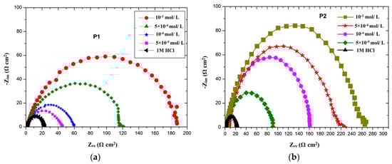 The degree of the corrosion protection could be determined by comparing the impedance values obtained in the presence and absence of an inhibitor in a corrosive environment. The Nyquist plots for mild steel obtained in an aqueous solution of HCl (1 M) interface with and without P1 and P2 at 308 K are shown in Figure 4 respectively.