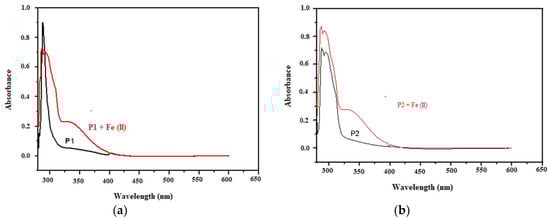 UV-Vis spectroscopic analysis was used to monitor compounds P1 and P2 in a 1.0 M solution of HCl (1 M) with inhibitors concentrations of 10−3 M before and after immersion of mild steel. The obtained UV-Vis spectra for P1 and P2 spectra are presented in Figure 6, the spectra show a red shift and a decrease in the value of absorbance, the results suggest the formation of a complex between Fe(III)) and compounds P1 and P2 [54].