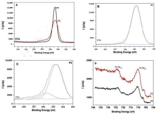 XPS C 1s core level spectra obtained for steel after treatment with HCl (1 M): (A) Comparison of the surface steel covered by P1 and P2 at 10−3 M; (B) Deconvoluted C 1s spectrum of the surface stell covered by P1; (C) Deconvoluted C 1s spectrum of the surface stell covered by P2. (D) Fe 2p core level spectra of the surface steel covered by P1 and P2 at 10−3 M.