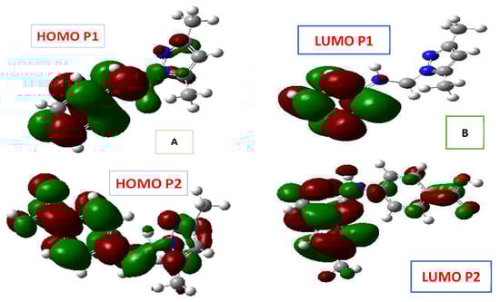 Optimized geometry and molecular orbital plots of studied pyrazole derivatives: (A) highest occupied molecular orbital (HOMO) and (B) lowest unoccupied molecular orbital (LUMO) for P1 and P2.