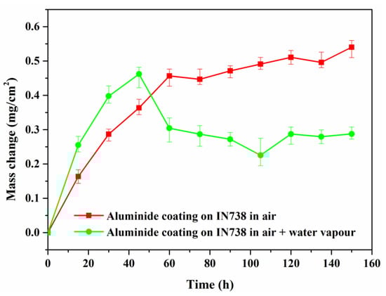 Cyclic oxidation kinetics of aluminide coating on an IN738 superalloy in air and air plus water vapour after being oxidized at 1050 °C for 150 h.
