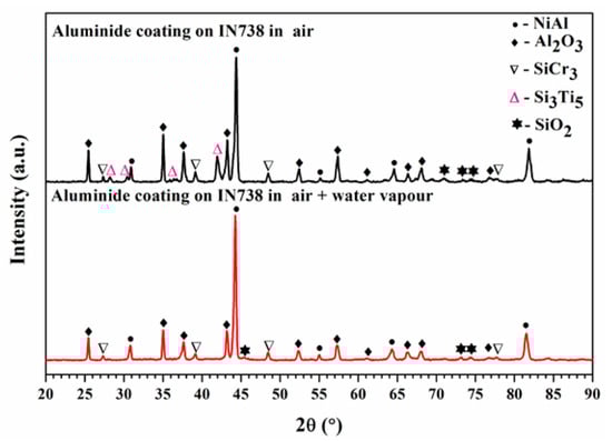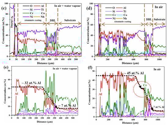 The Al content was less than ~32 at.% in the aluminide coating in air plus water vapour, but the Al content was more than 45 at.% in the aluminide coating which oxidized in air (Figure 6e,f). Figure 6f shows that the Al concentration exhibits a stepwise that decreased from the aluminide coating to substrate. However, the concentration of Al in the substrates was same (~7 at.%) both in air and water vapour atmospheres. It is worth noting that the O content is higher at the aluminide coating/DBL interface in air plus water vapour (~10 at.%) than that in air (~5 at.%), as shown in Figure 6c.