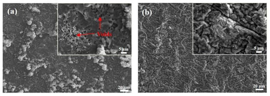 The XRD patterns of the aluminide coating oxidized at 1050 °C are displayed in Figure 2. The X-ray patterns exhibit clear diffraction peaks, indicating the oxidation products for the samples in air and air plus water vapour. The external oxide scales were principally composed of Si3Ti5 in air, and other phases, such as SiO2 and SiCr3, are weakly detected. Moreover, the main phase of the external oxide scale is Al2O3 whether the coatings are oxidized in air or in air plus water vapour. Elements concentration gradient between the aluminide coating and substrate drive Ti migrate from substrate into aluminide coating during cyclic oxidation, so Si reacts with Ti to Si3Ti5. Si3Ti5 phase can easily react with water. So, water vapour leads to the formation of SiO2 and the destruction of the Si3Ti5 phase. Figure 3 shows the surface oxide morphologies formed on aluminide oxidized after 150 h. Figure 3a indicates that the voids that were formed on partially localized oxide scales and spallation can be observed in air plus water vapour. The alloy surface is mostly covered with dense and unbroken Al2O3 scale, as shown in Figure 3b.
