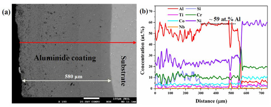 (a) Cross-sectional micrograph of the aluminide coating after been heat treated at 850 °C in argon for 24 h, and (b) corresponding energy-dispersive X-ray spectrometer (EDX) line profiles of the elemental distributions across the aluminide layer on an IN738 superalloy.