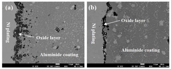Cross-section SEM images of an aluminide coating on an IN738 superalloy in air and air plus water vapour after being oxidized at 1050 °C for 150 h: (a) in air + water vapour, and (b) in air.