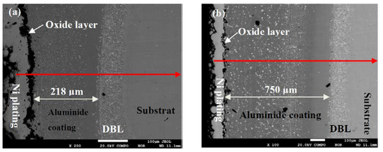 To hinder the inward diffusion of Al to the substrate, a diffusion barrier layer (DBL) between the aluminide coating and superalloy can effectively prevent the interdiffusion of the elements. Electron beam physical vapour deposition (EB-PVD) [15,16] and cathodic electrodeposition [17] have been used to form DBLs on the alloys. Yao et al. [18] deposited a NiCrO interlayer (1.8 μm) as the DBL on René N5 superalloy samples while using arc ion plating, and the NiCrO DBL effectively retarded the coating degradation during cyclic oxidation tests. A Re-based DBL deposition on a Ni-based superalloy via electroplating [19] inhibited interdiffusion of the elements between the aluminide coating and the substrate. However, the methods that are mentioned above require an additional deposition step, which increases the costs and possibility of spallation. To simplify the preparation of the DBL, a self-forming DBL has been demonstrated at the aluminide coating/substrate interface. The reason for forming the DBL is element interdiffusion between coating and substrate [20,21,22]. Ma et al. [23] reported the relationship between the growth and temperature of the DBL (intermetallic layer) that was formed in Pd/Cu and Pd/Ag porous stainless steel, the DBL formed by the oxidation of the substrate at 430 °C, and the DBL was effective in reducing the intermetallic diffusion at 500 °C. Müller et al. [24] discussed the effects of reactive element oxides and the property of diffusion on a self-forming DBL on nickel-based superalloys, and the DBL was destroyed due to the reaction of Y and Hf from MCrAlY (M = Ni, Co). The above studies indicated that the relationships between the growth, temperatures and reactive element oxides of the DBL, as well as its oxidation resistance, are complex and not yet fully understood at high temperature. Therefore, many factors affect the growth and morphology of the DBL. The relationship between the growth of the DBL and diffusion of elements in different atmospheres requires further study.