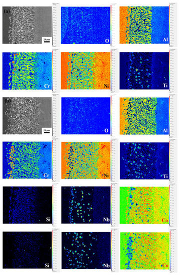The cross-section EPMA mappings of aluminide coating after oxidation in air and in air plus water vapour for 150 h are shown in Figure 7. Figure 7a illustrates that O tends to distribute in the topmost interface between the aluminide coating and DBL, where it also contained Nb and a small volume of Ti. According to the mapping results (Figure 7b), a Cr-rich layer formed at the aluminide coating/DBL interface, which was formed due to the outward diffusion of Cr during the oxidation process. The DBL can preserve the Al element diffusion between the aluminide coating and substrate; therefore, the oxidation resistance of the aluminide coating has not been affected via interdiffusion. When compared with the distribution of Si element in air plus water vapour (Figure 7a), there is no obvious difference in the distribution of Si element in air.