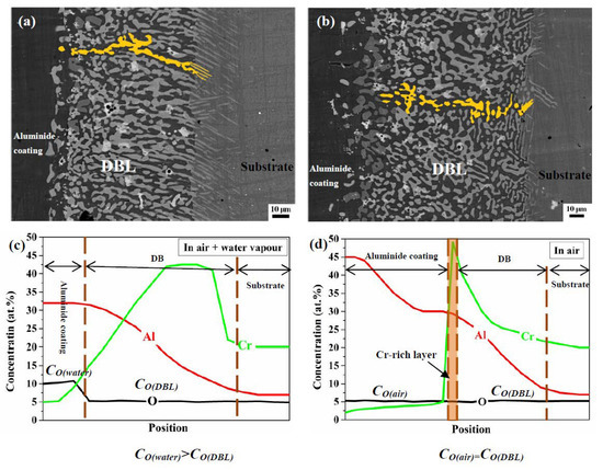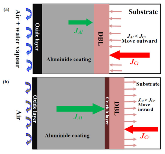 The Si/Cr-rich layer as a DBL within the aluminide coating has a low diffusion flux of O (JO), thus just allowing a small amount of O to pass through this layer. Oxygen can diffuse through the coating to the substrate, where it can be detected by EDS [32,33]. Similar to a dam, the DBL blocks interdiffusion between the aluminide coating and substrate. Therefore, low PO in air contributed to the lower CO(air) than that in air plus water vapour, as shown in Figure 8d. Moreover, when JAl was far greater than JAl(water), Al enrichment at the aluminide coating/DBL interface was promoted. Al in the aluminide layer mainly depleted by the inward diffusion of Al to the substrate in air, because dense Al2O3 was formed at the surface, leading to a small amount of O inward diffusion to the aluminide coating in air. High JAl promotes the inward movement of the DBL, as shown in Figure 9b. Yao et al. [18] observed Cr segregation occurred in the interdiffusion zone for the NiAl coating after 200 1-h cycles at 1100 °C in air. High JAl hinders the Cr outward diffusion from the substrate to the aluminide coating, which leads to the enrichment of Cr in the DBL. The oxidizing environment affects the movement of the DBL, which in turn, changes the concentration of elements in the aluminide coating. Therefore, the evolution of the DBL and oxidation behaviour can affect each other.