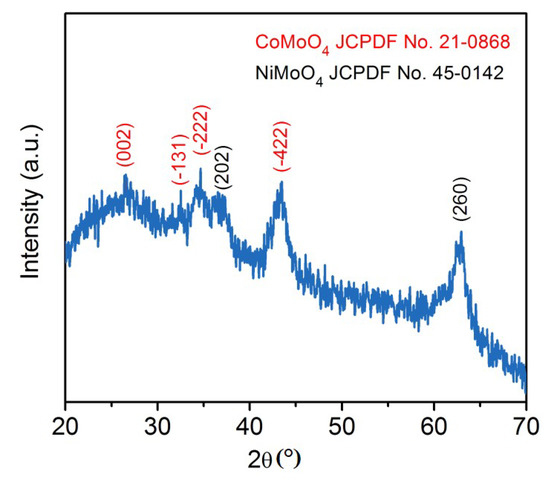 The crystal structure of the obtained product scratched from NF was examined by XRD, and the corresponding pattern is shown in Figure 1. The observed diffraction peaks at the degrees of 36.6 and 62.9 could be indexed to the (202) and (260) planes of the cubic phase of NiMoO4 (JCPDF card No. 45-0142), and the other diffraction peaks can be indexed to CoMoO4 (JCPDF card No. 21-0868) [36,37]. Moreover, the peak intensities are relatively weak and broad, which indicates the poor crystallization of the NCMO nanosheets. The poor crystallization is beneficial for increased electrochemical performance because more defect transportations are present in materials with weak crystallinity [38]. It is also worth noting that, differing from the previous reported Ni-Co-Mn oxides, Ni-Co-Zn oxides, and other mixed metal oxide nanostructures prepared by a similar hydrothermal method, the hydrothermal processed NCMO nanosheets do not show the spinel structure. It could be caused by the substitution of Mo, which affected the spinel crystal structure significantly [26,27,39].