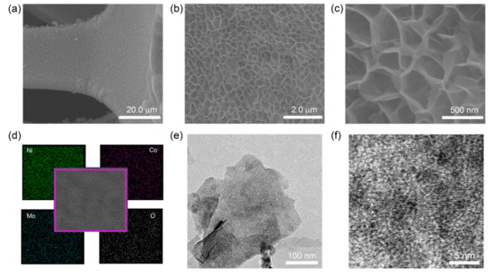 From the SEM images in Figure 2a–c, it can be seen that the crinkly NCMO nanosheets are uniformly and continuously deposited on NF. The NCMO nanosheets interlace with each other to arrange vertically on the substrate, forming an open-up network structure. The average thickness of the nanosheets is approximately 40 nm. The corresponding elemental mapping images, including Ni, Co, Mo, and O elements, have been separately listed in Figure 2d and indicate the uniform dispersion of all the elements. Further insight into the detailed microstructure was elucidated by TEM. Figure 2e,f shows the low- and high-resolution TEM images of NCMO nanosheets. The surface of the NCMO nanosheets is continuous and relatively thin with a porous architecture, which could be ascribed to the successive release and loss of the produced gas during thermal reactions [40,41,42]. The thin and mesoporous characteristics of the nanosheets may provide a large surface area and more electroactive sites for Faradaic reactions, facilitating charge transfer between the electrode interface and electrolyte. The high-resolution TEM image of Figure 2f demonstrated the polycrystalline characteristics.