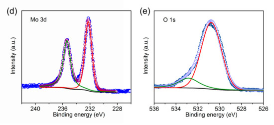 XPS measurements were carried out to further confirm the element compositions and the chemical states of the NCMO nanosheets. The corresponding experimental and fitted spectra are presented in Figure 3. As shown in Figure 3a, peaks of Ni, Co, Mo, and O elements are visualized. The deconvolutions of Ni 2p, Mo 2p, Co 2p, and O 1s are presented in Figure 3b–e, respectively. As indicated in Figure 3b, the Ni 2p XPS spectrum presents two spin-orbit doublets and two satellites. Ni 2p1/2 and Ni 2p3/2 spin-orbit peaks are located at 873.4 and 856.1 eV, respectively, with a splitting energy of 17.3 eV, implying the existence of the Ni2+ oxidation state in the nanosheet arrays [42]. The Co 2p region can be best fitted into two prominent peaks in Figure 3c with the binding energies at 786.3 and 804.2 eV, corresponding to the Co 2p1/2 and Co 2p3/2 levels, which is a signature of Co2+ and Co3+ oxidation states [43]. In Figure 3d, the peaks at 235.3 and 232.3 eV are ascribed to Mo 3d3/2 and Mo 3d5/2 levels, respectively [44]. The spin-orbit splitting value of Mo 3d3/2 and Mo 3d5/2 is 2.0 eV, which signifies the Mo6+ oxidation state in NCMO nanosheets. The fitted peaks of the O 1s XPS spectrum in Figure 3e centered at 531.5 and 532.8 eV. The main peak at 531.5 eV confirms the formation M–O (M = Co, Ni, Mo) bonds and the dwarf peak at 532.8 eV may be associated with the deficient oxygen or the surface-absorbed oxygen species in NCMO nanosheets [45].