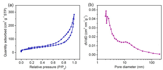 (a) Nitrogen (77 K) adsorption/desorption isotherms and (b) the corresponding pore size distribution profile of the NCMO nanosheets.