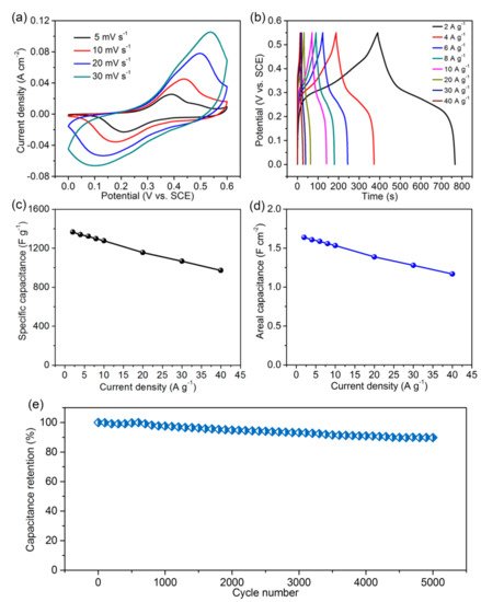 The specific and areal capacitances calculated from the GCD plots are pictured in Figure 5c,d, respectively. The specific capacitances are as high as 1366, 1340, 1323, 1298, 1277, 1156, 1066, and 973 F g−1 and the areal capacitances are 1.64, 1.61, 1.59, 1.56, 1.53, 1.39, 1.28, and 1.17 F cm−2 at current densities from 2 to 40 A g−1, respectively [35]. Moreover, the NCMO nanosheets hold 71.3% retention of the capacitance, revealing the good rate capability and diffusion limitation effect [16]. The cycling stability measured by the repetitive charge and discharge processes at the current density of 30 A g−1 was depicted in Figure 5e. Impressively, the specific capacitance had a retention of 89.75% even after 5000 cycles.