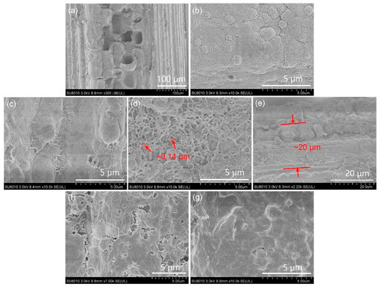 SEM images of (a) pristine bamboo; (b) TiO2-B and ZnO/TiO2-B with different concentrations of Zn(NO3)2 during the coating process: (c) 0.05 M ZnO/TiO2-B, (d) 0.1 M ZnO/TiO2-B; (e) The cross-section of the coating of 0.1 M ZnO/TiO2-B; (f) 0.2 M ZnO/TiO2-B; and (g) 0.3 M ZnO/TiO2-B.